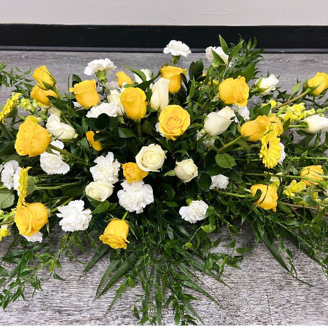 Palm Leaves, Ruscus, Roses, Gerbera Daisy And Stocks