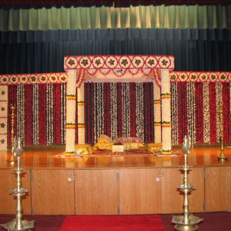 Square Flower Mandap with side panels is made with fresh flowers. The color of the flowers can be selected based on your color scheme. The mandap with side panels requires 26 ft X 12 ft Stage. It requires only 10 ft head room. It comes with chairs or pedam, two carpets, two brass lamps with flower decorations, two banana trees, haven kundam. The price does not include the transportation cost.